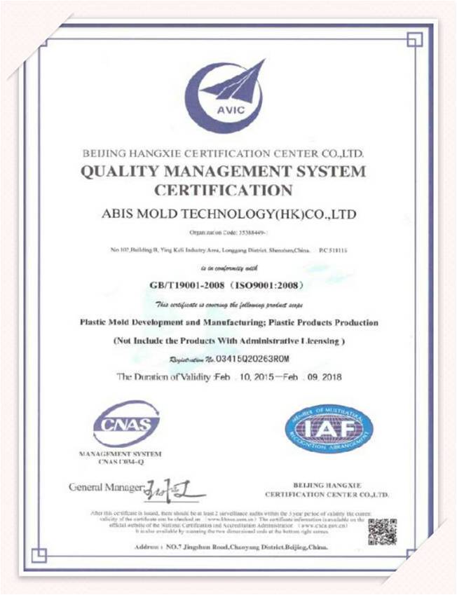 ABIS는 Auto CAD, UG, Solid works 및 ProE 등 금형 설계에 고급 소프트웨어를 적용합니다. 지금까지 ABIS는 "ISO 9001", "ROHS"녹색 SGS 인증서를 받았습니다.